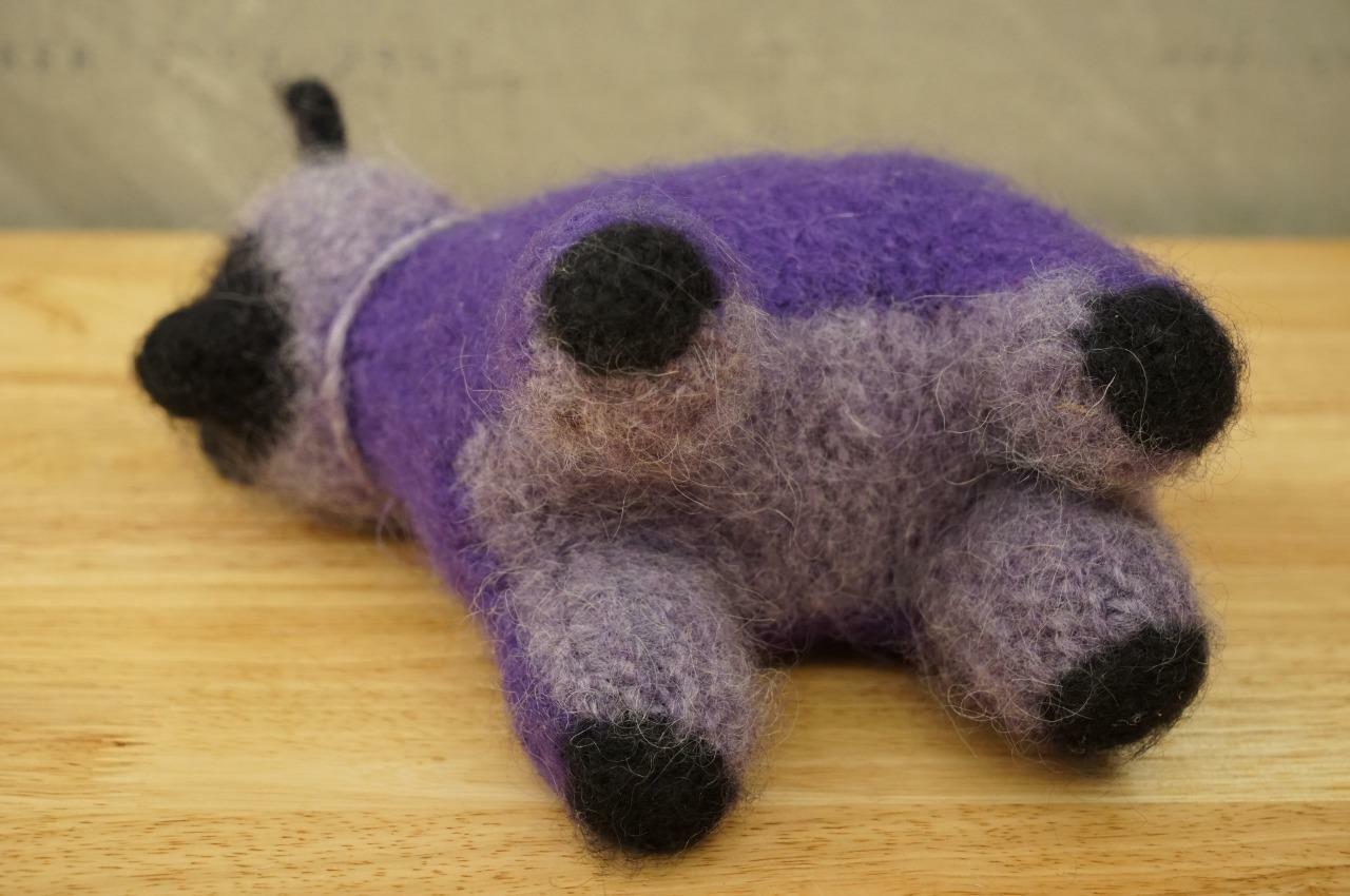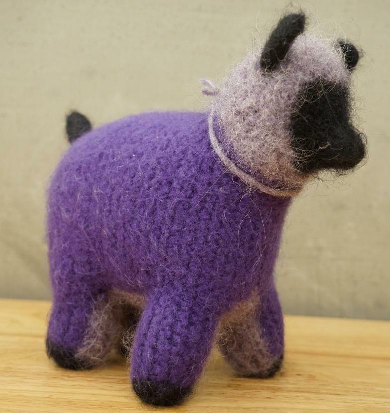 Hand Crafted Baby Toddler Plush Toy Fuzzy Purple Black Knitted Wool Sheep. Two tone purple and black knitted body. All wool. Stuffed with polyfiber fill. No button to come off with small children. Feed the imagination with unique hand crafted toys. The sheep measures 9" tall and 9" long. No smoke or pet odors.