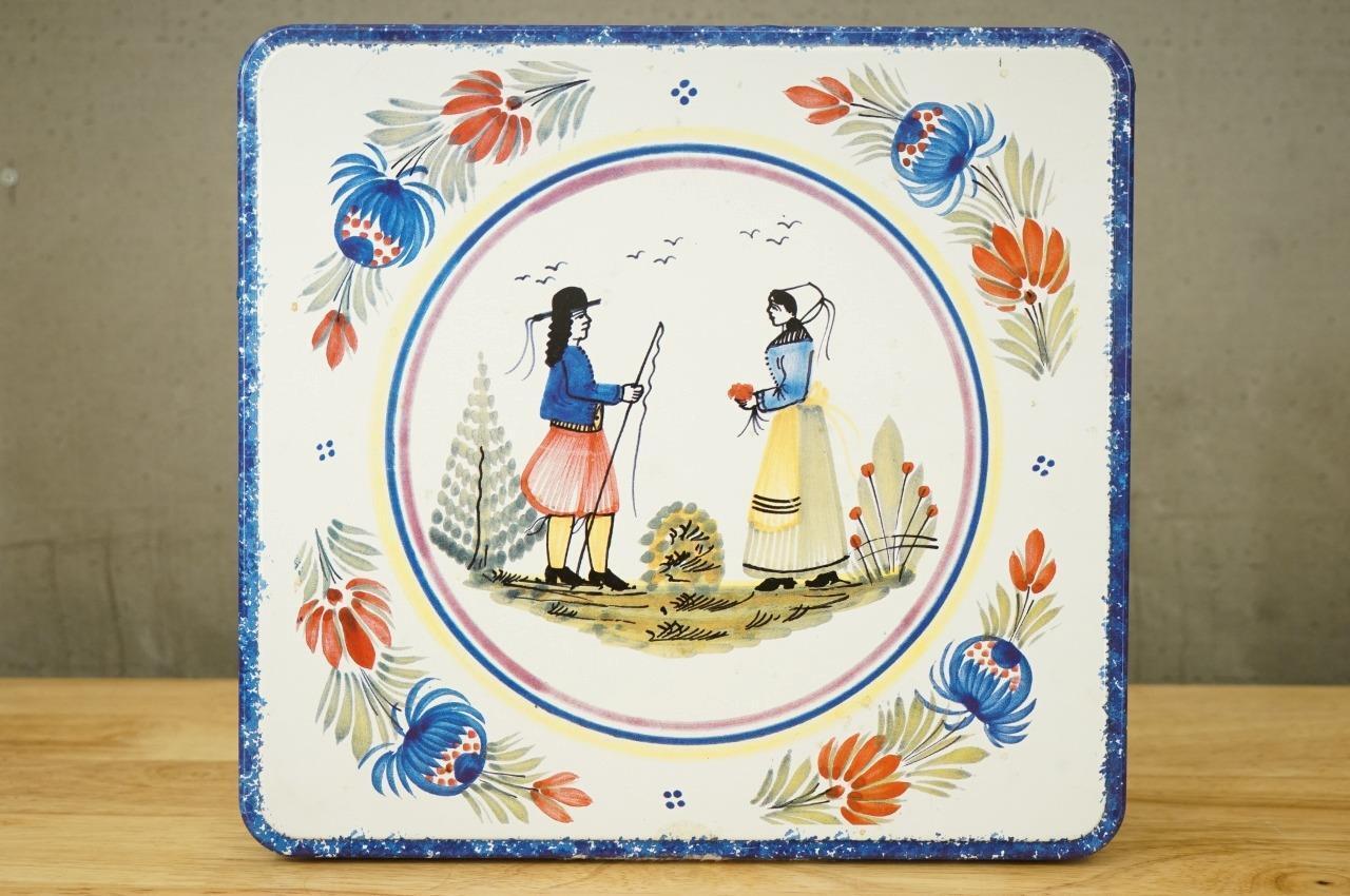 Vintage 3PC Metalware Lot Massilly France Tins Litho QUIMPER Pattern HB Henriot. The square tin measures 9.25" square. The round canister is 8" tall and 4.5" in diameter. The flat tray measures 6-7/8" by 4.25"
