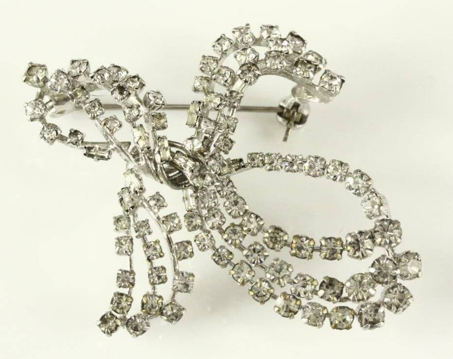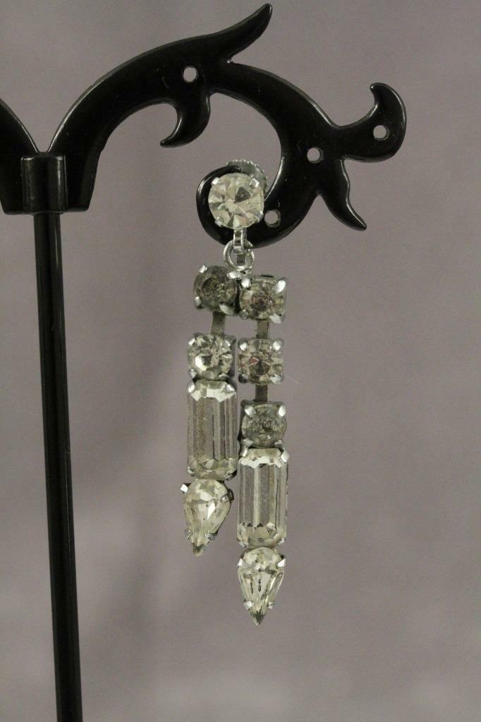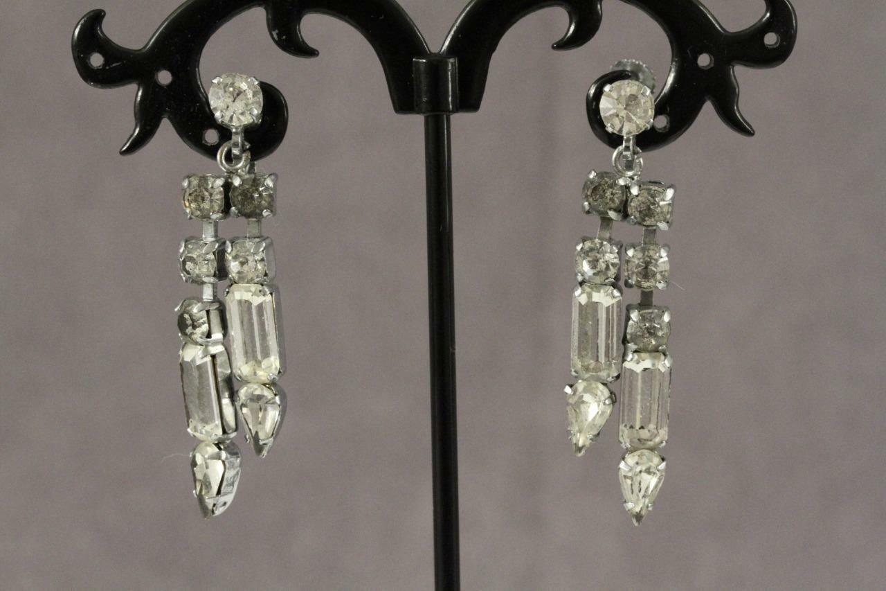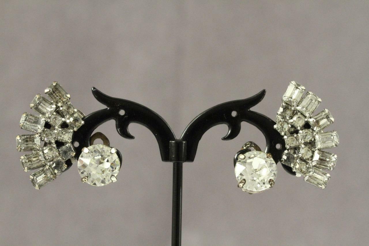 Vintage Costume Jewelry 1950 Era Prom Jewelry Rhinestone Necklace Earrings Pin. The necklace is 15" long. Two pairs of clip earrings and one pair of screwback earrings, one brooch pin 2.25" across. Smoke and pet odor free. All direct from a local estate.