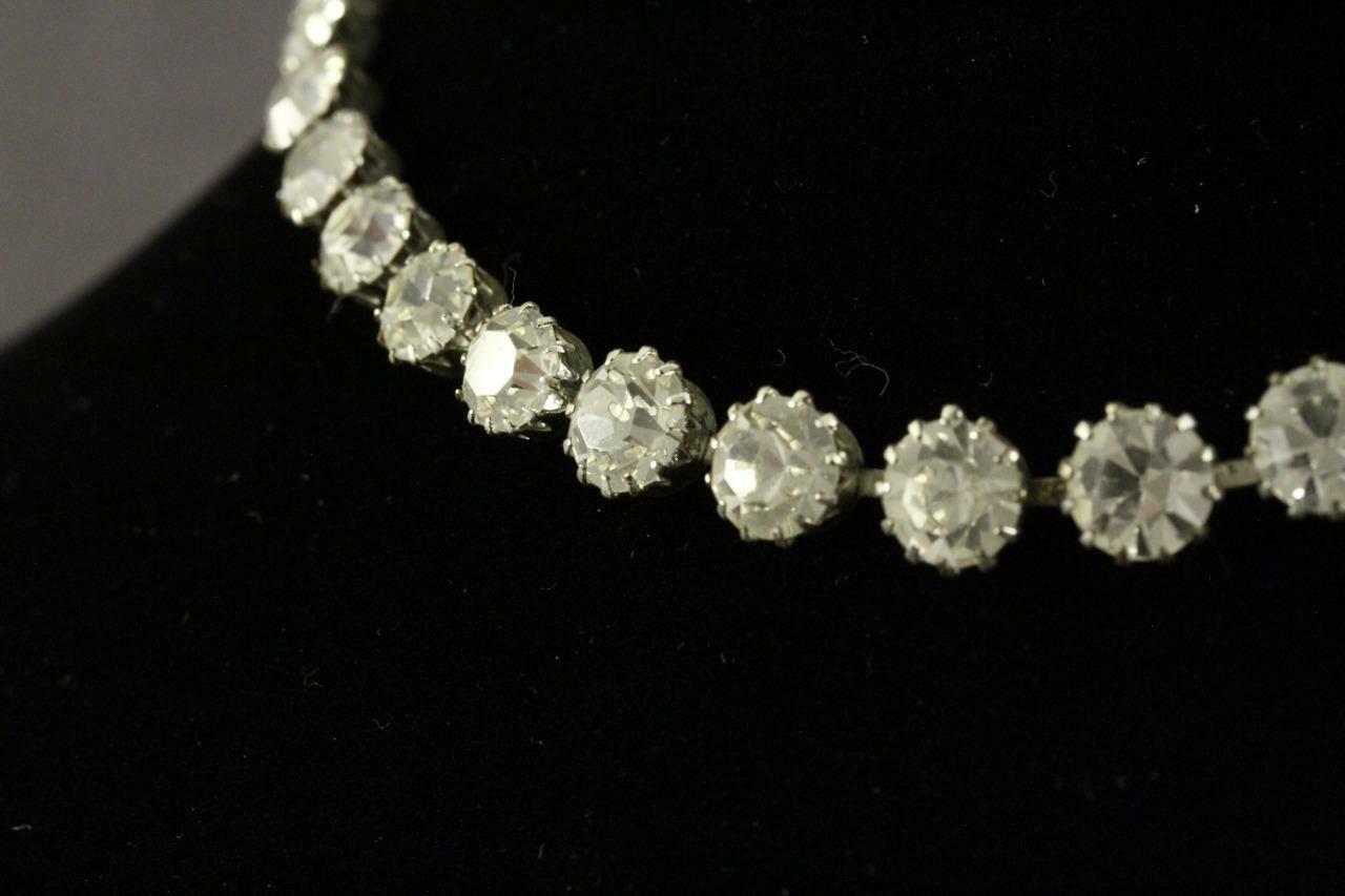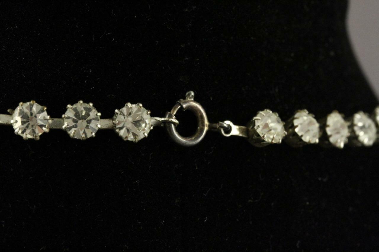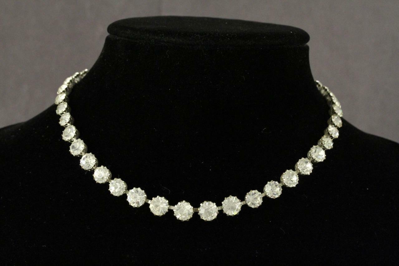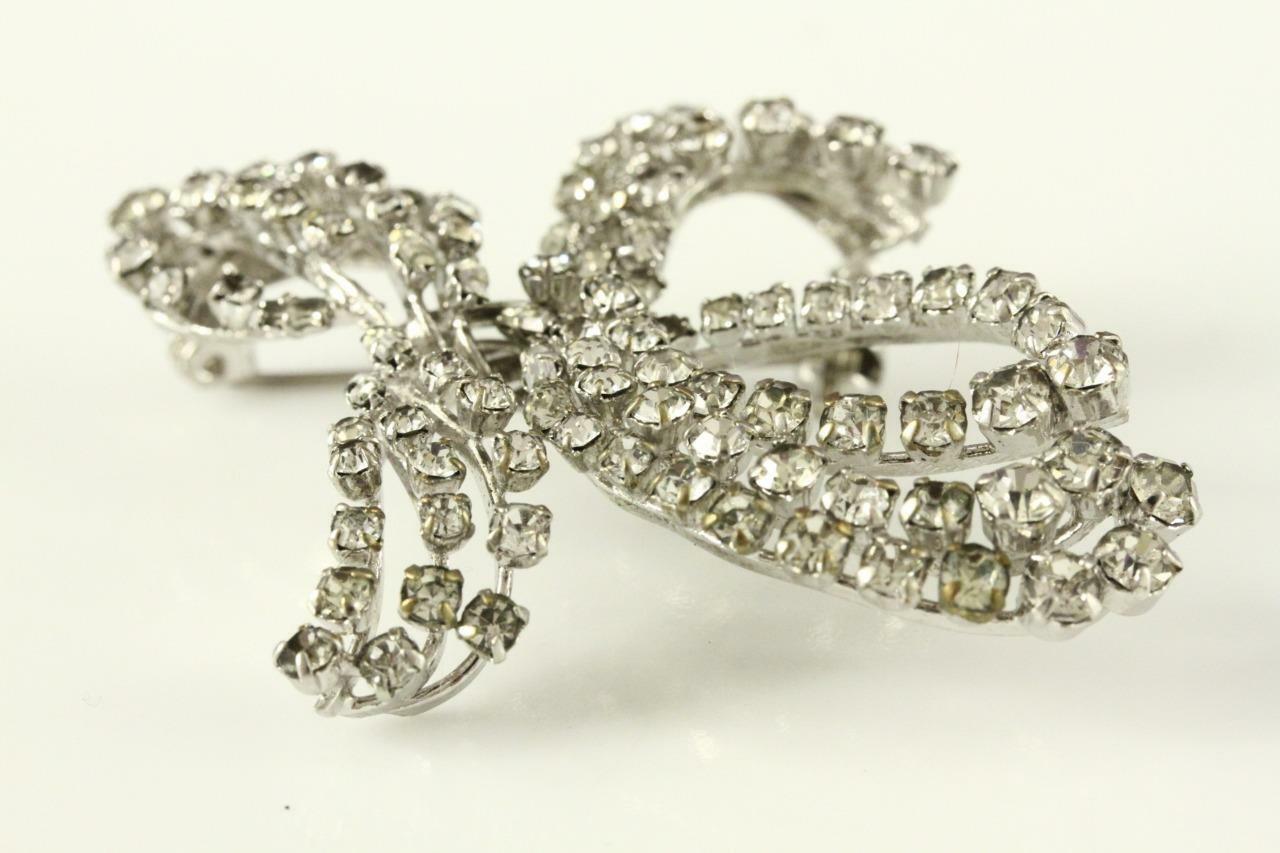 Vintage Costume Jewelry 1950 Era Prom Jewelry Rhinestone Necklace Earrings Pin. The necklace is 15" long. Two pairs of clip earrings and one pair of screwback earrings, one brooch pin 2.25" across. Smoke and pet odor free. All direct from a local estate.