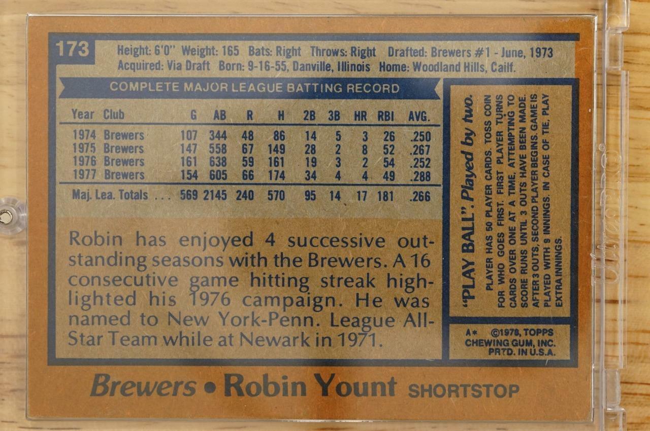 Vintage 1978 Topps Baseball Card ROBIN YOUNT Milwaukee Brewers #173 Shortstop. Mounted in a one touch.