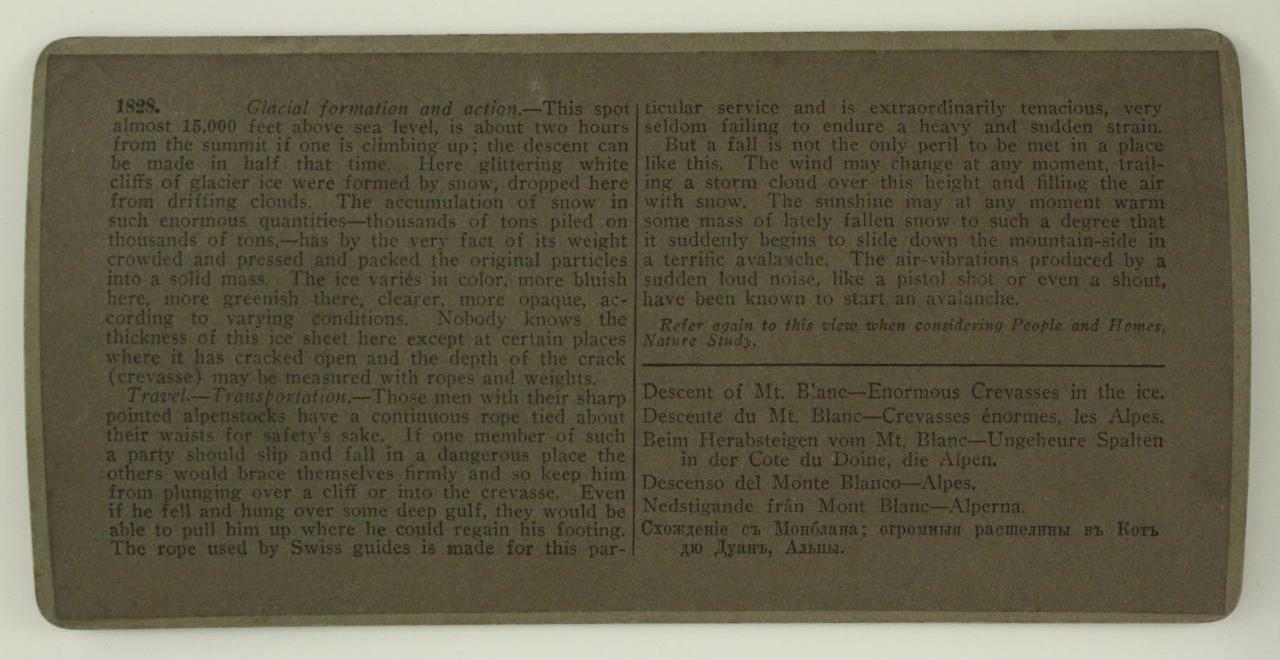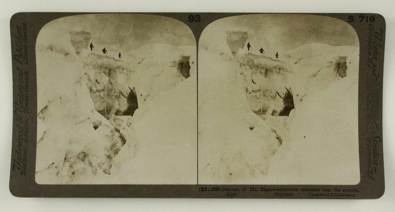 Vintage Stereoscope Photo Underwood S719 Mt. Blanc Mountain Climbers Summit Alps. This card features ta group of mountain climbers at the descent of Mt. Blanc and the enormous crevasses neear the summit. Card is overall in crisp condition but there is a noted curve or bend. There is no smoke or pet odor.