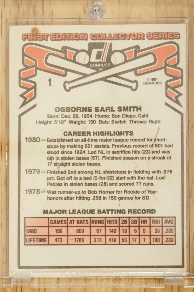 Vintage 1981 Donruss Baseball Trading Card OZZIE SMITH Padres Shortstop #1. Mounted in a one touch.