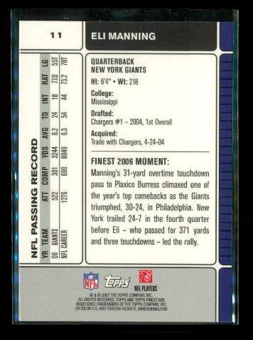 2007 TOPPS FINEST Chrome Football Trading Card #11 ELI MANNING New York Giants