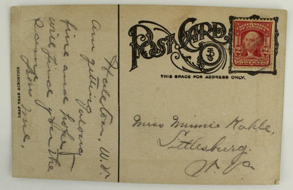 Vintage Paper Postal History Postcard LEAP YEAR Greetings, West Virginia Littlesburg to Miss Minnie Kahle in Haleton (hard to make out) West Virginia. Postmark could not be determined, hard to read, direct from a local estate. Bishop is the artist name on the front of the postcard. Condition Good. Smoke and pet free. You get the exact card shown in the photos. Please refer to photos in listing for further information on condition.