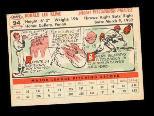Vintage BASEBALL Card TOPPS 1956 #94 RONNIE KLINE Pitcher Pittsburgh Pirates - white back, light corner and edge wear. Light browning.