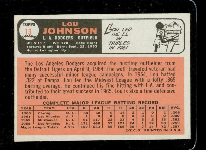 Vintage 1966 Topps BASEBALL Trading Card #13 LOU JOHNSON LA Dodgers Outfield