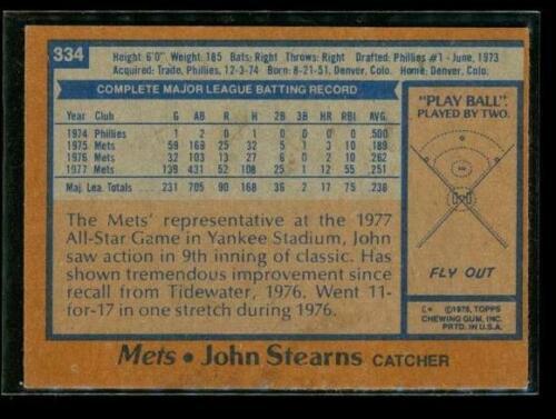 Vintage 1978 TOPPS Baseball Trading Card #334 JOHN STEARNS New York Mets
