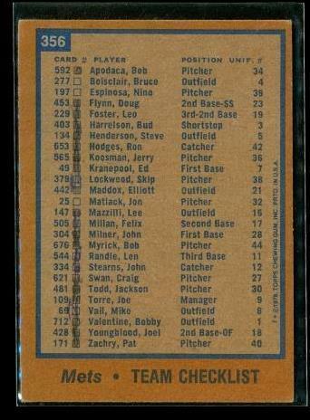 Vintage 1978 TOPPS Baseball Trading Card #356 TEAM CHECKLIST New York Mets