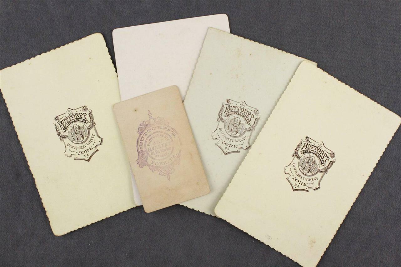 Vintage Lot 5 Early Cabinet Card Photos York PA Buttorff W Market St York PA - one smaller size with photo stamp on the back. Smoke and pet odor free. Date range estimate 1870-1890