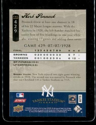 2008 UD Baseball Card Yankee Stadium Legacy YSL429 HERB PENNOCK 1920 - 1930
