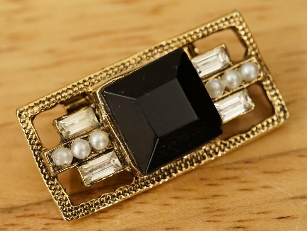 Vintage Costume Jewelry Gold Tone Black Glass Rhinestone Bar Brooch Pin with faux pearl accents. Measures 1.25" by 5/8". No smoke or pet odors.