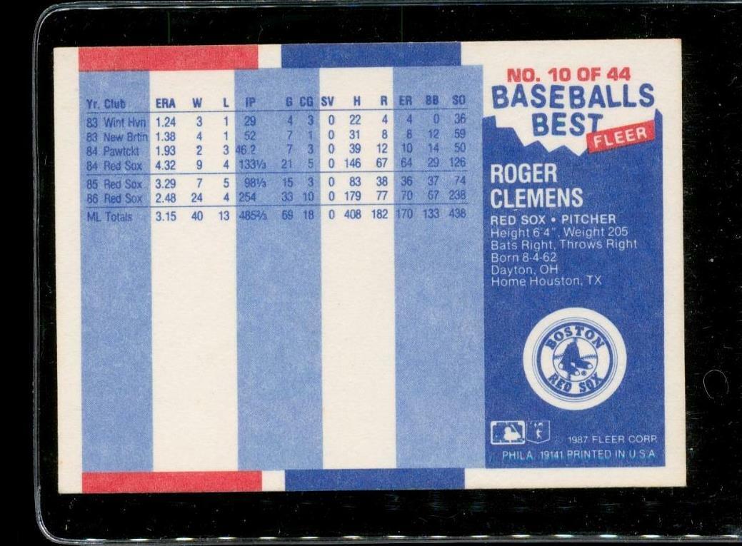 Vintage 1987 FLEER BASEBALLS BEST Baseball Trading Card #10 OF 44 ROGER CLEMENS Boston Red Sox