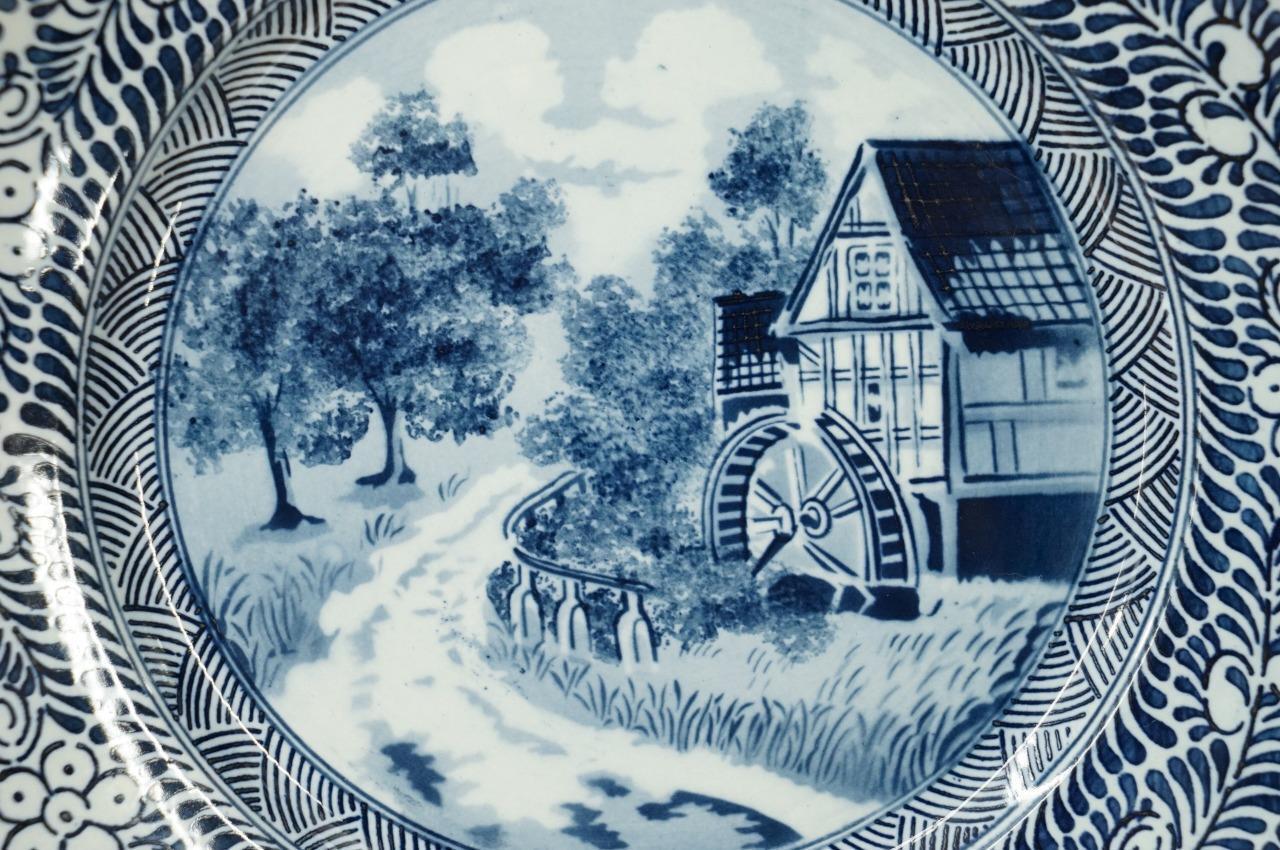 Antique China Germany Flow Blue Plate Franz Anton Mehlem Water Wheel Plate - signed on the back. No smoke or pet odor. No chips or cracks. Tight fine crazing under the glaze. Measures 9-3/8" across.