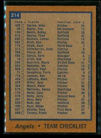 Vintage 1978 TOPPS Baseball Trading Card #214 TEAM CHECKLIST Los Angeles Angels