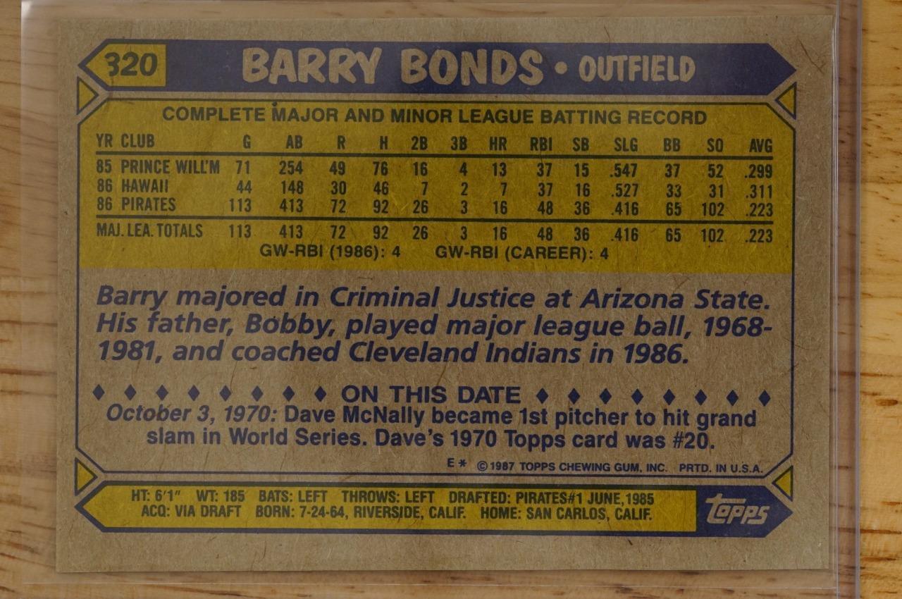 1987 Topps #320 BARRY BONDS Rookie RC Baseball Card Pittsburgh Pirates Lot #5