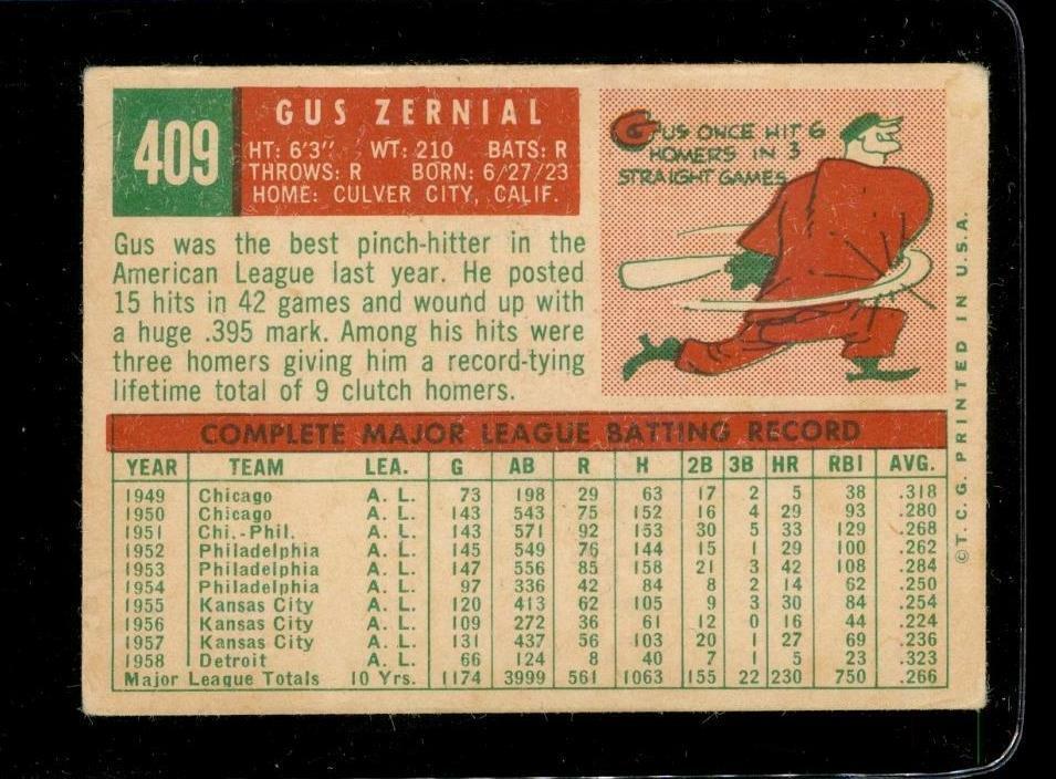 Vintage BASEBALL Card TOPPS 1959 #409 GUS ZERNIAL Detroit Tigers Outfield WB