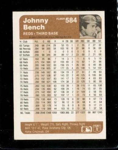 Vintage 1983 FLEER Baseball Trading Card #584 JOHNNY BENCH Cincinnati Reds