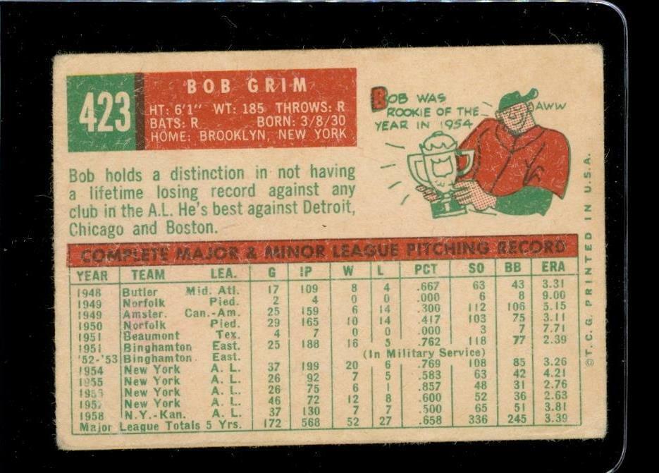 Vintage BASEBALL Card TOPPS 1959 #423 BOB GRIM Kansas City A's Pitcher WB