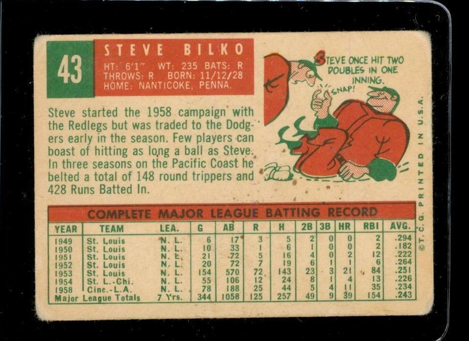 Vintage BASEBALL Card TOPPS 1959 #43 STEVE BILKO LA Dodgers 1st Base WB
