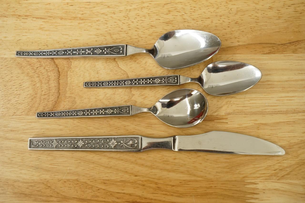 Vintage Estate 14PC Lot Stainless Steel Flatware Riviera CORDOVA Pattern Japan. Includes (5) teaspoons, (4) tablespoons, (1) sugar spoon and (4) knives. You get the exact pieces you see in the photos. 14 pieces total.