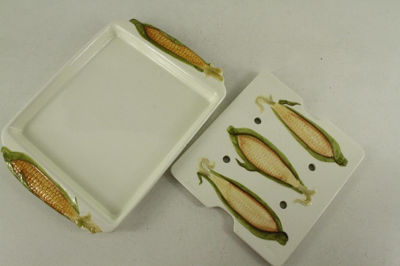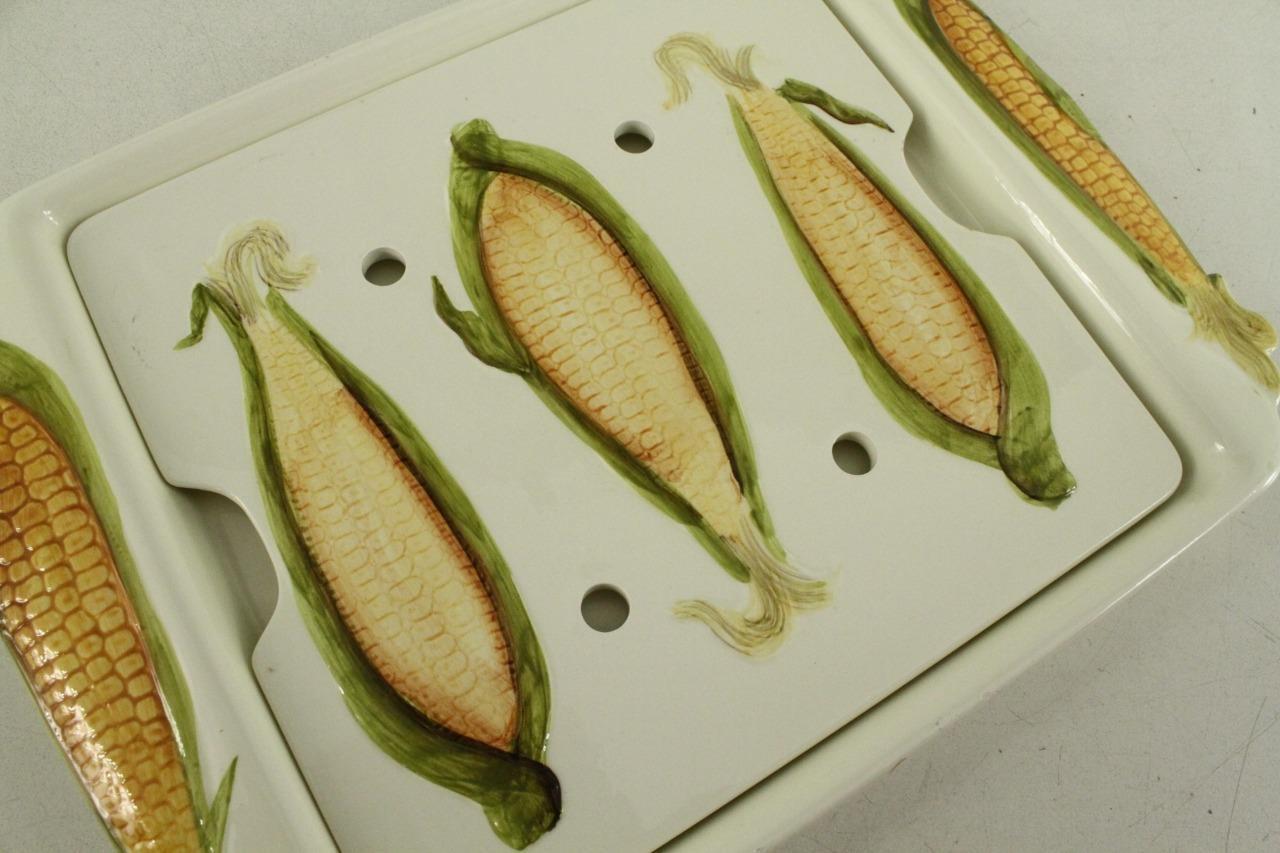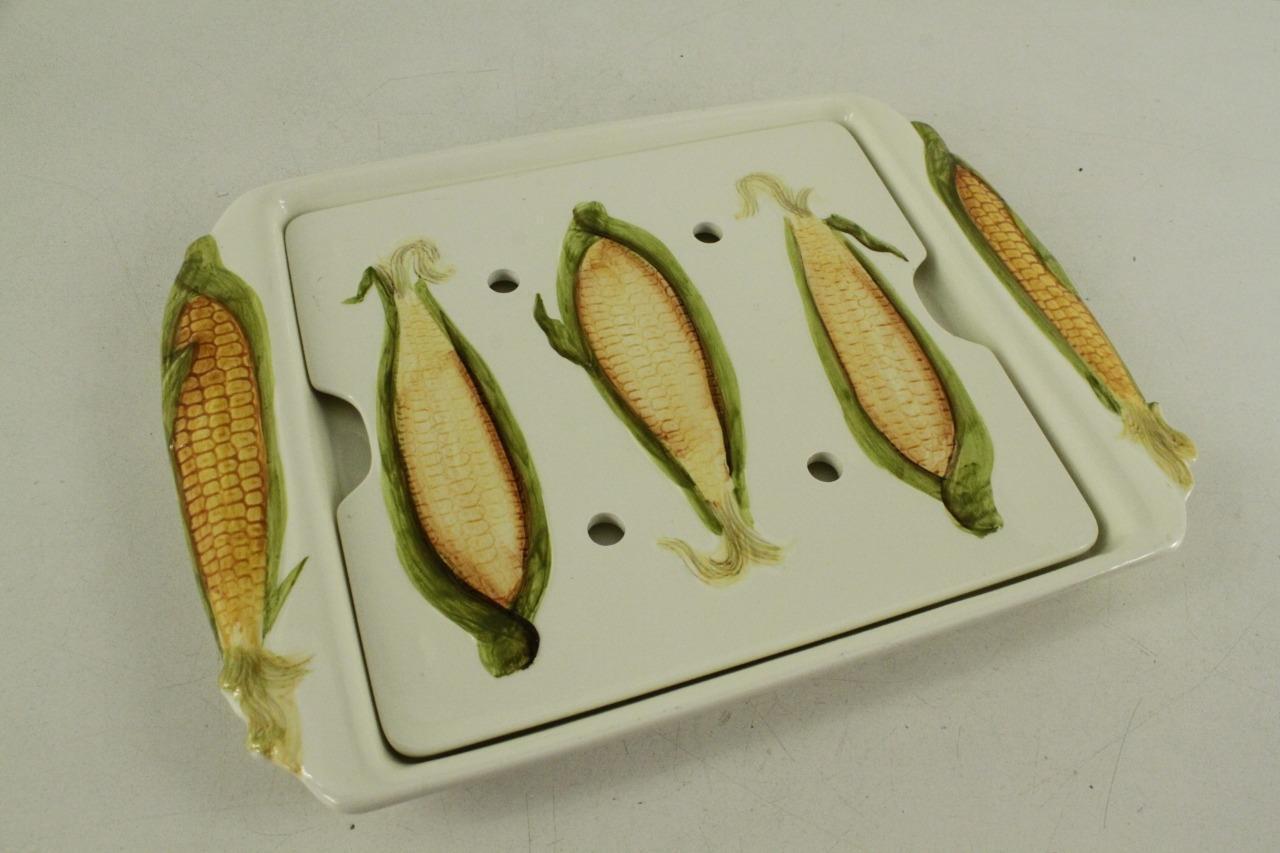 Vintage Kitchen Ceramic Hand Painted Corn On The Cob 2PC Serving Tray With Drain