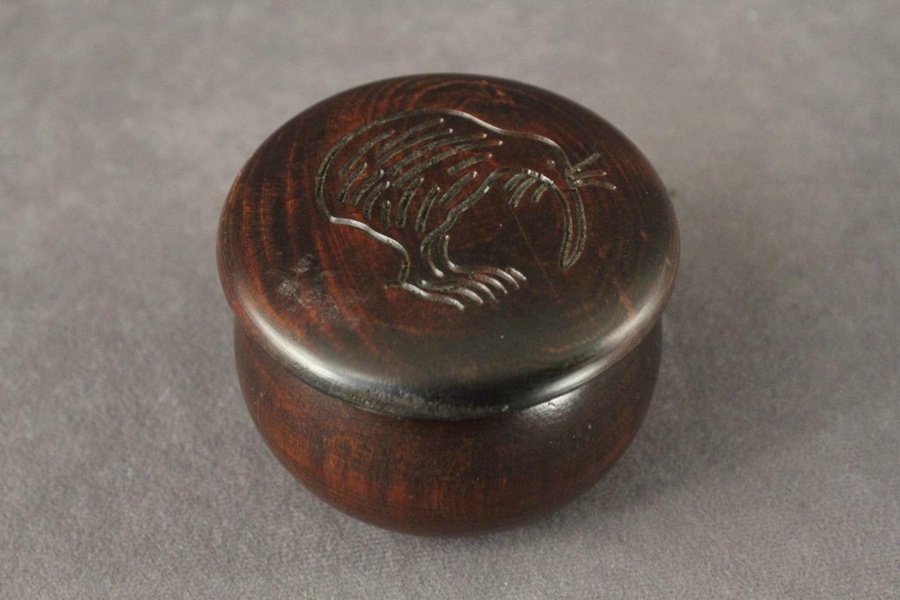 Vintage New Zealand Carved Wood Round Trinket Box Souvenir Kiwi Bird Rotorua - measures 2.5" tall. 3.5" across.