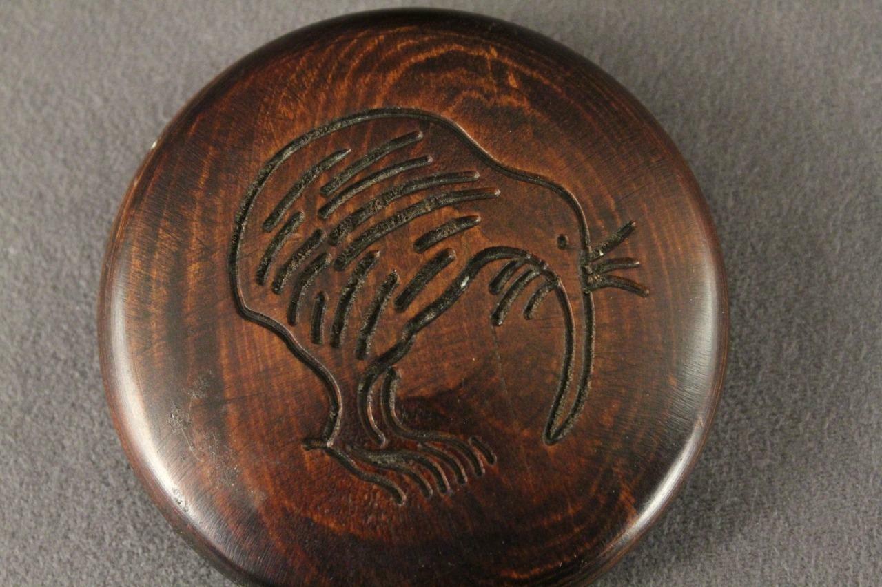 Vintage New Zealand Carved Wood Round Trinket Box Souvenir Kiwi Bird Rotorua
