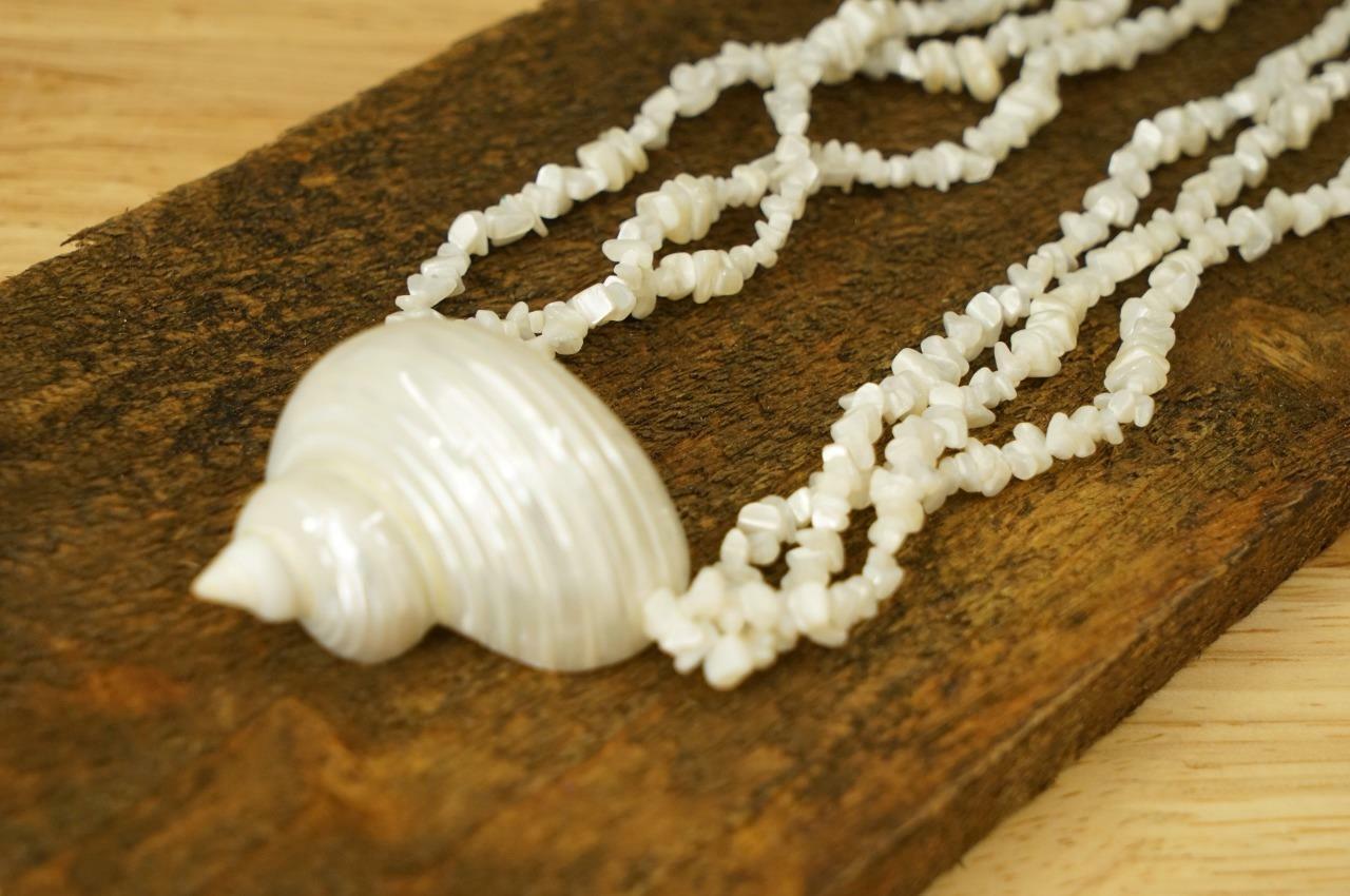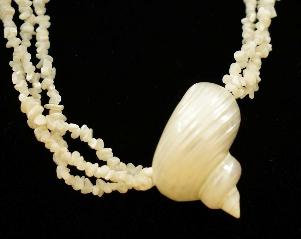 Artisan Jewelry Polished MOP Turban Shell Multi Strand Beaded Statement Necklace. The shell measures 2.25" tall. 3 strands. 28" long. No smoke or pet odor. Please pay close attention to the measurements as the mannequin is not life size. Heavy, chunky piece.