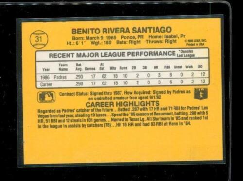 Vintage 1986 DONRUSS RATED ROOKIE Baseball Trading Card #31 BENITO SANTIAGO San Diego Padres