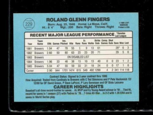Vintage 1985 DONRUSS Baseball Trading Card #229 ROLLIE FINGERS Milwaukee Brewers