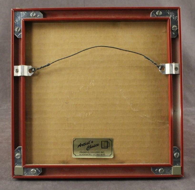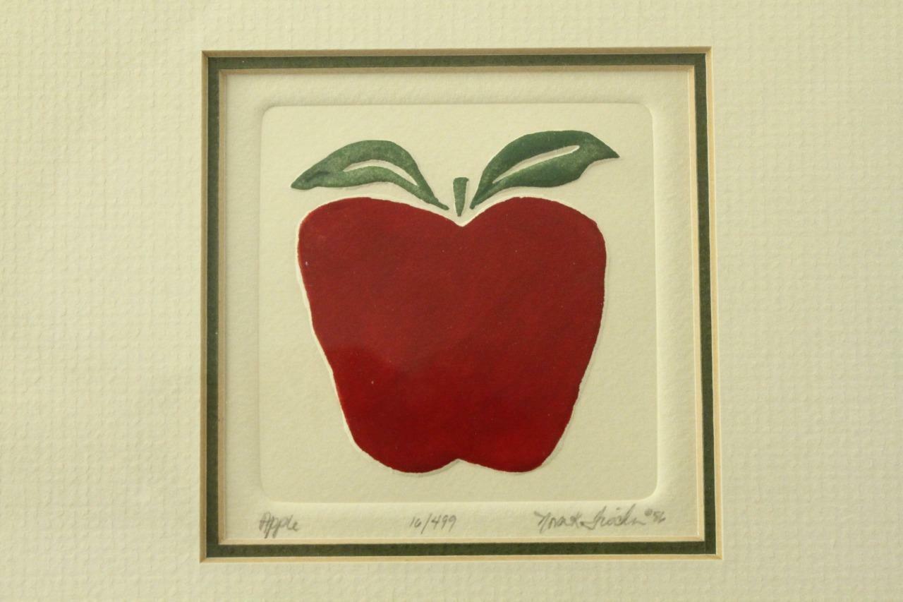 Vintage Signed Framed Paper Stamped Teacher Art Nora K Fisher APPLE LE 10/499. Simple red metal frame. The frame size is 8.25" square. The art measures 3.5" square in the matte.