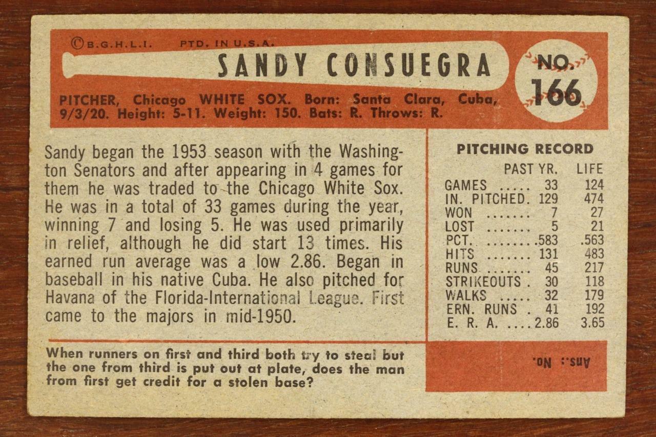 Vintage BASEBALL Card 1954 BOWMAN #166 SANDY CONSUEGRA Chicago White Sox Pitcher