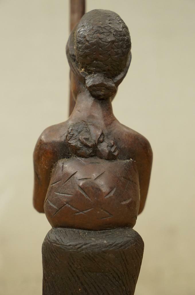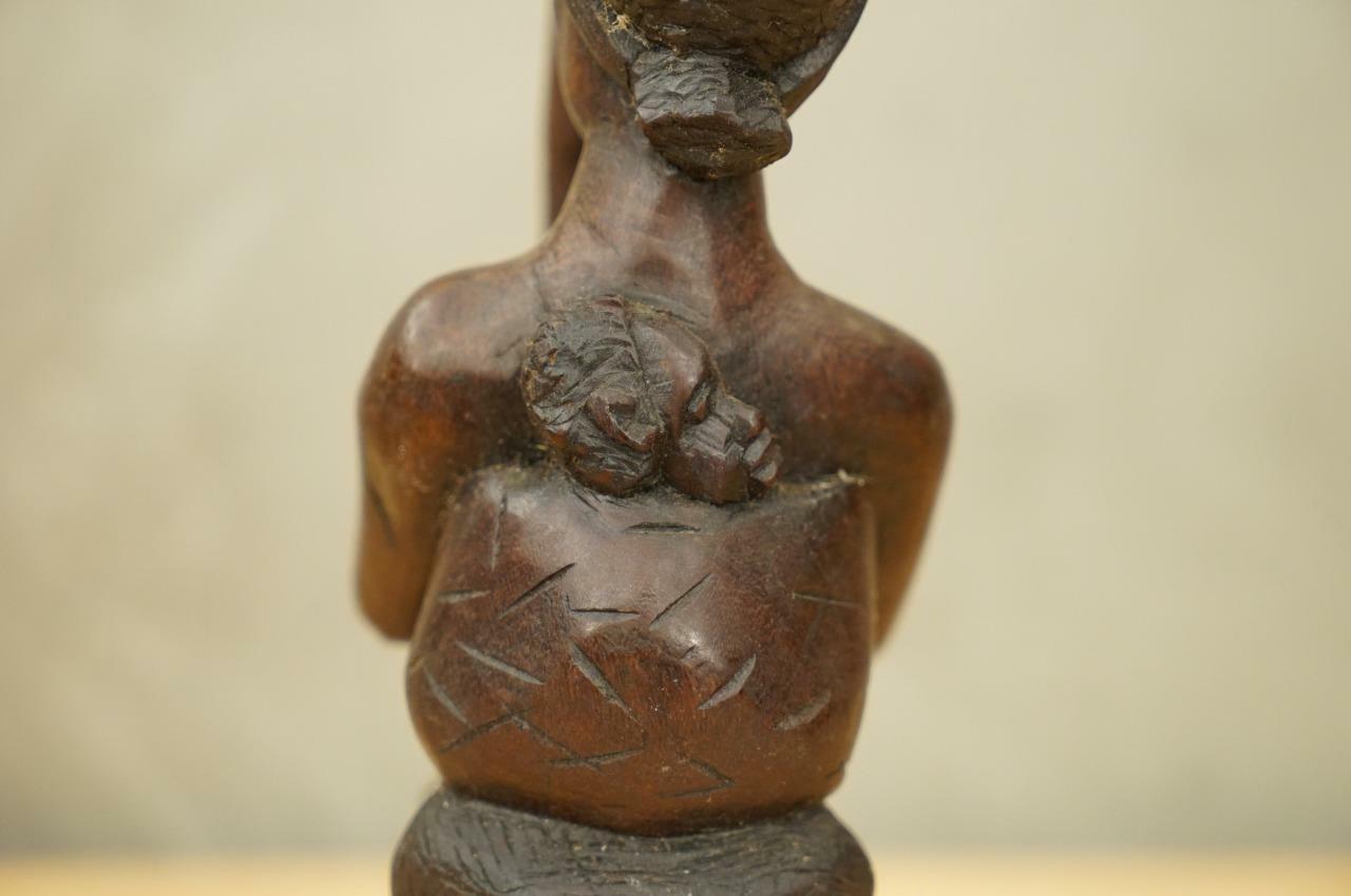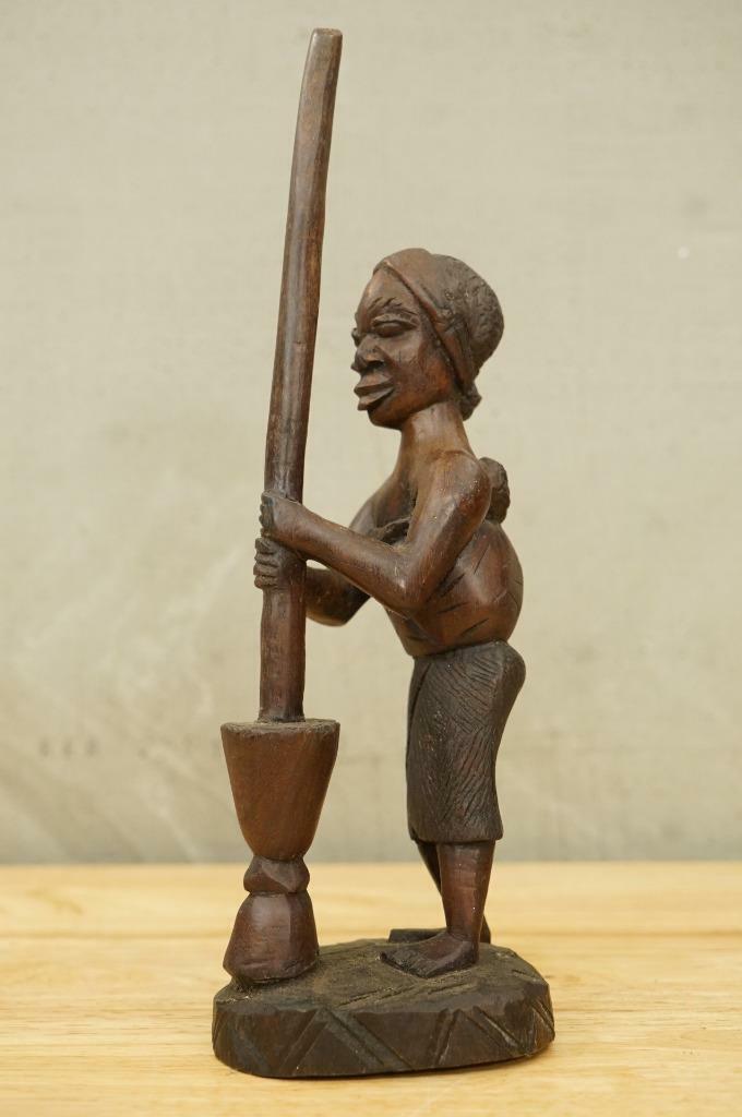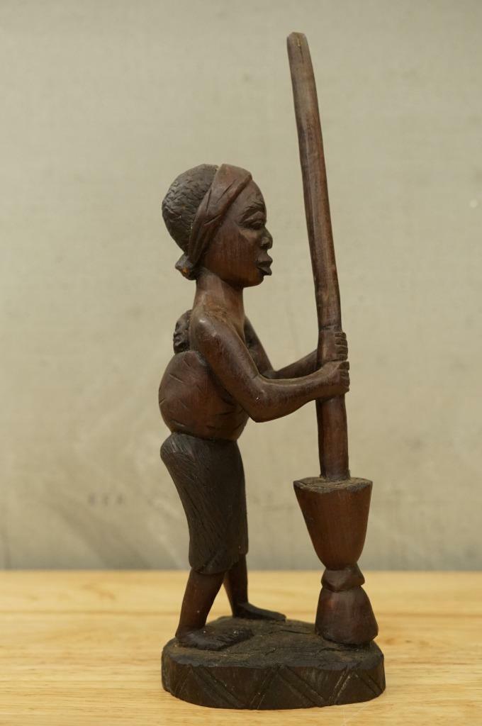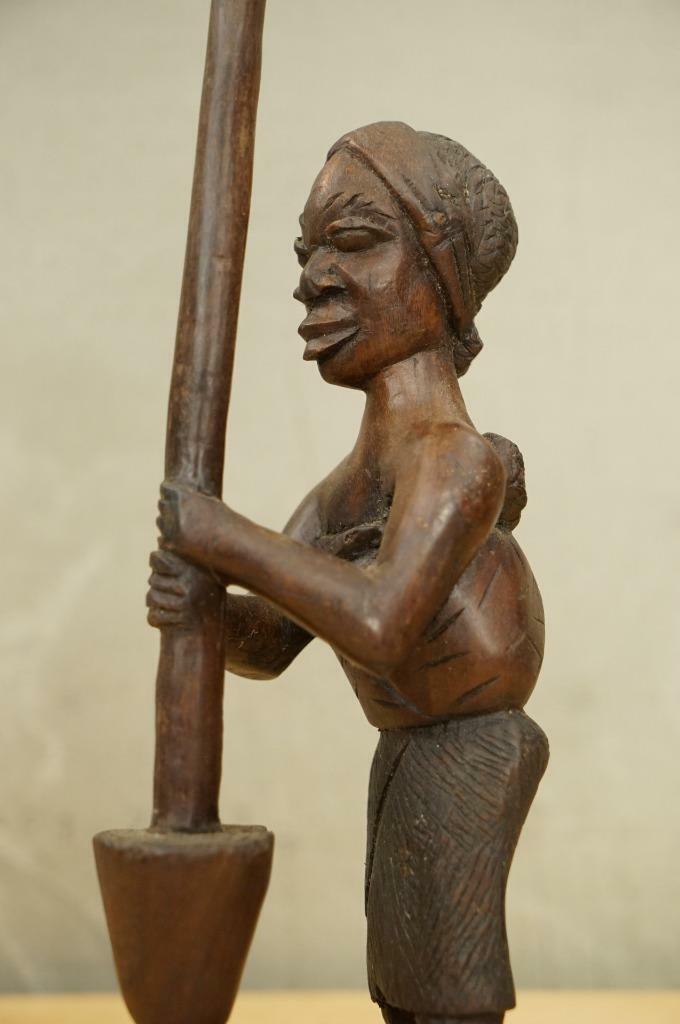 Vintage Ethnic African Art Carved Wood Figurine Mother Child Pounding Maize. Dark reddish brown wood. Measures 12.75" tall. Her baby is in a wrap on her back while she pounds maize. Central Africa. Smoke and pet odor free.