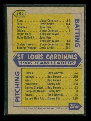 Vintage 1987 TOPPS Baseball Trading Card #181 ST LOUIS CARDINALS LEADERS