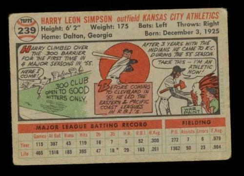 Vintage BASEBALL Card TOPPS 1956 #239 HARRY SIMPSON Outfield Kansas City A's - fair with creasing mostly left side, but also right side margin. Placer card. Soft corners, edgewear and light browning.
