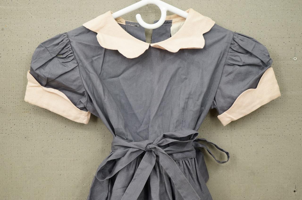 VINTAGE Halloween Costume 1950's Era Cinderella Walt Disney Hand Sewn Kids Dress. This dress is 23" long from neck to hem. Gathered waist with tie. Denim blue with the palest of pink trim accents. 20-24" waist with the elastic. Old browning spots noted on the back (see photos). Great for a 2-3 year old. Smoke and pet odor free.