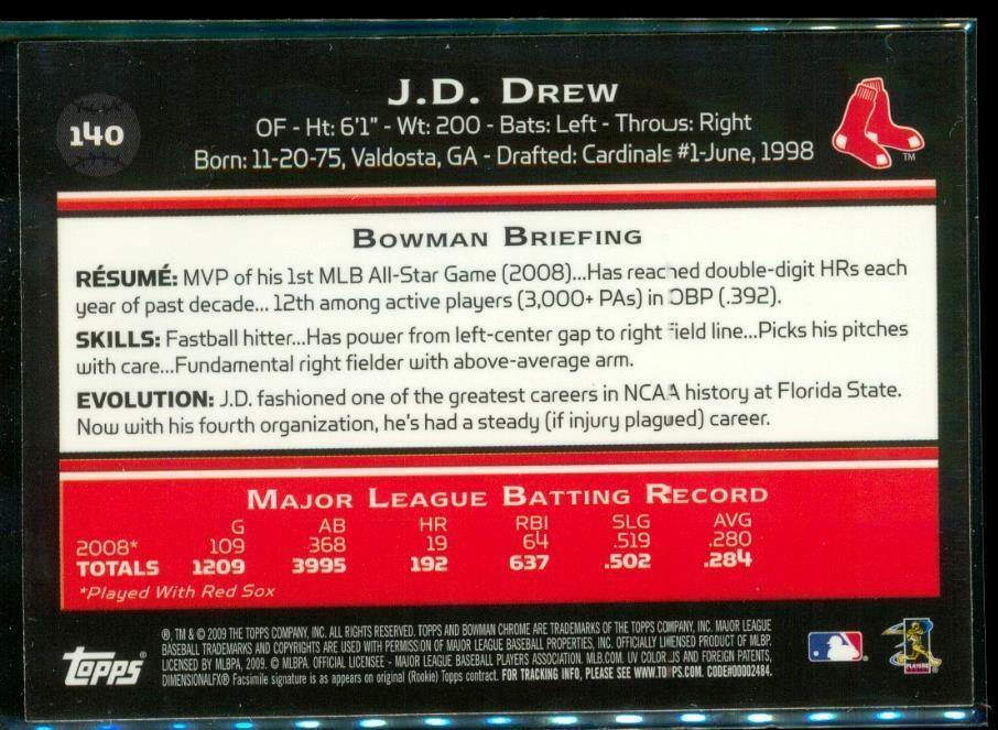 2009 Baseball Card TOPPS Bowman Chrome #140 JD DREW Boston Red Sox - Outfield