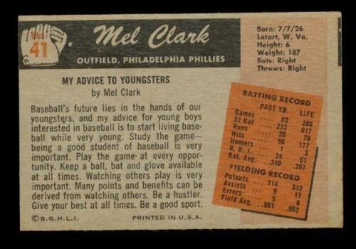Vintage 1955 BASEBALL Card BOWMAN #41 MEL CLARK Outfield Philadelphia Phillies. Light corner and edge wear. Light browning noted.
