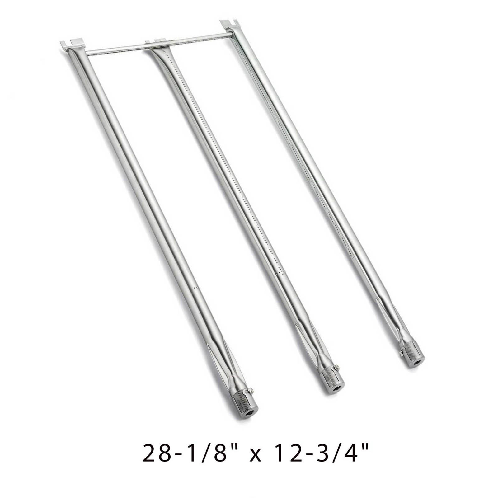 Dimensions: Outer burners are 28 1/8" long, center burner is 27 3/8"and cross over is 12 3/4". Comes with built-in mesh screen venturi spider guards