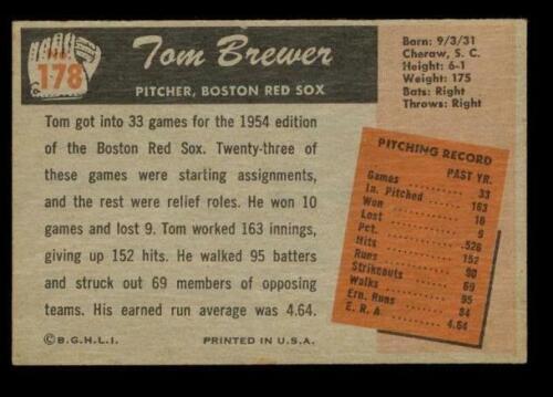 Vintage 1955 BASEBALL Card BOWMAN #178 TOM BREWER Pitcher Boston Red Sox - light edge and corner wear. Light browning.