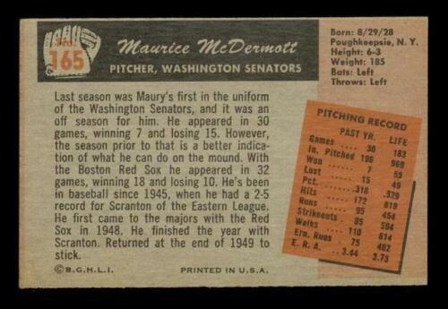 Vintage 1955 BASEBALL Card BOWMAN #165 MAURICE McDERMOTT Washington Senators - light edge and corner wear.