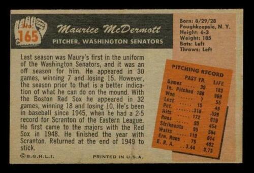 Vintage 1955 BASEBALL Card BOWMAN #165 MAURICE McDERMOTT Washington Senators - light edge and corner wear. Light browning.