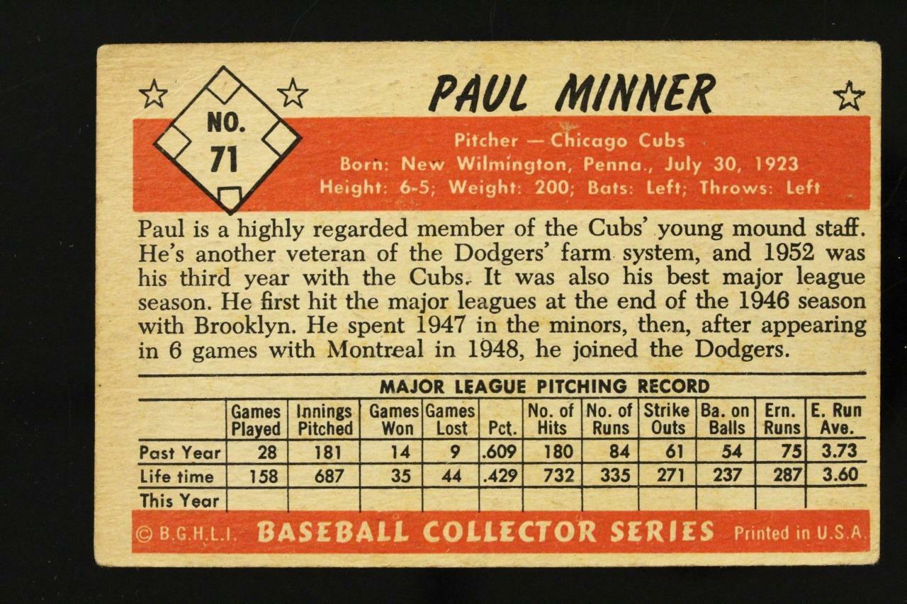 Vintage 1953 Baseball Card Bowman Color #71 PAUL MINNER Chicago Cubs Pitcher