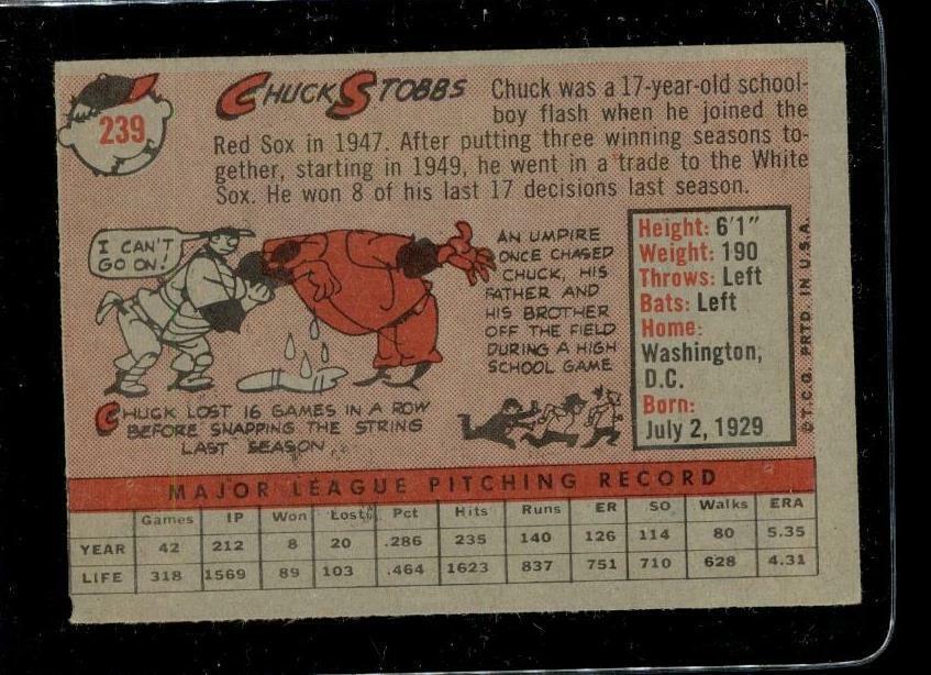 Vintage BASEBALL Trading Card TOPPS 1958 #239 CHUCK STOBBS Washington Senators