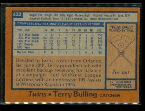 Vintage 1978 TOPPS Baseball Trading Card #432 TERRY BULLING Minnesota Twins