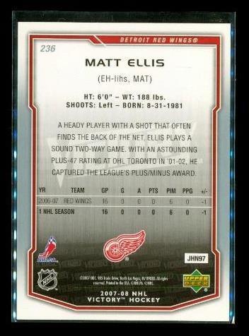 2007 UPPER DECK VICTORY Rookie Hockey Trading Card #236 MATT ELLIS Detroit Red Wings