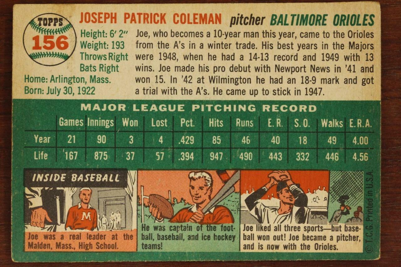 Vintage 1954 Baseball Card TOPPS #156 JOE COLEMAN Pitcher Baltimore Orioles. Browning, corner wear noted. You get the EXACT card shown in the photos.