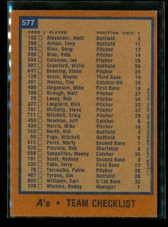 Vintage 1978 TOPPS Baseball Trading Card #577 TEAM CHECKLIST Oakland A's
