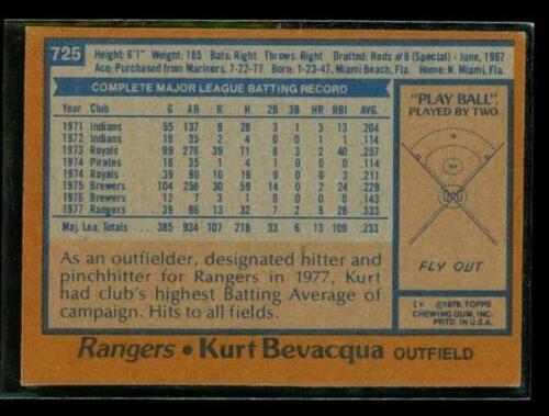 Vintage 1978 TOPPS Baseball Trading Card #725 KURT BEVACQUA Texas Rangers